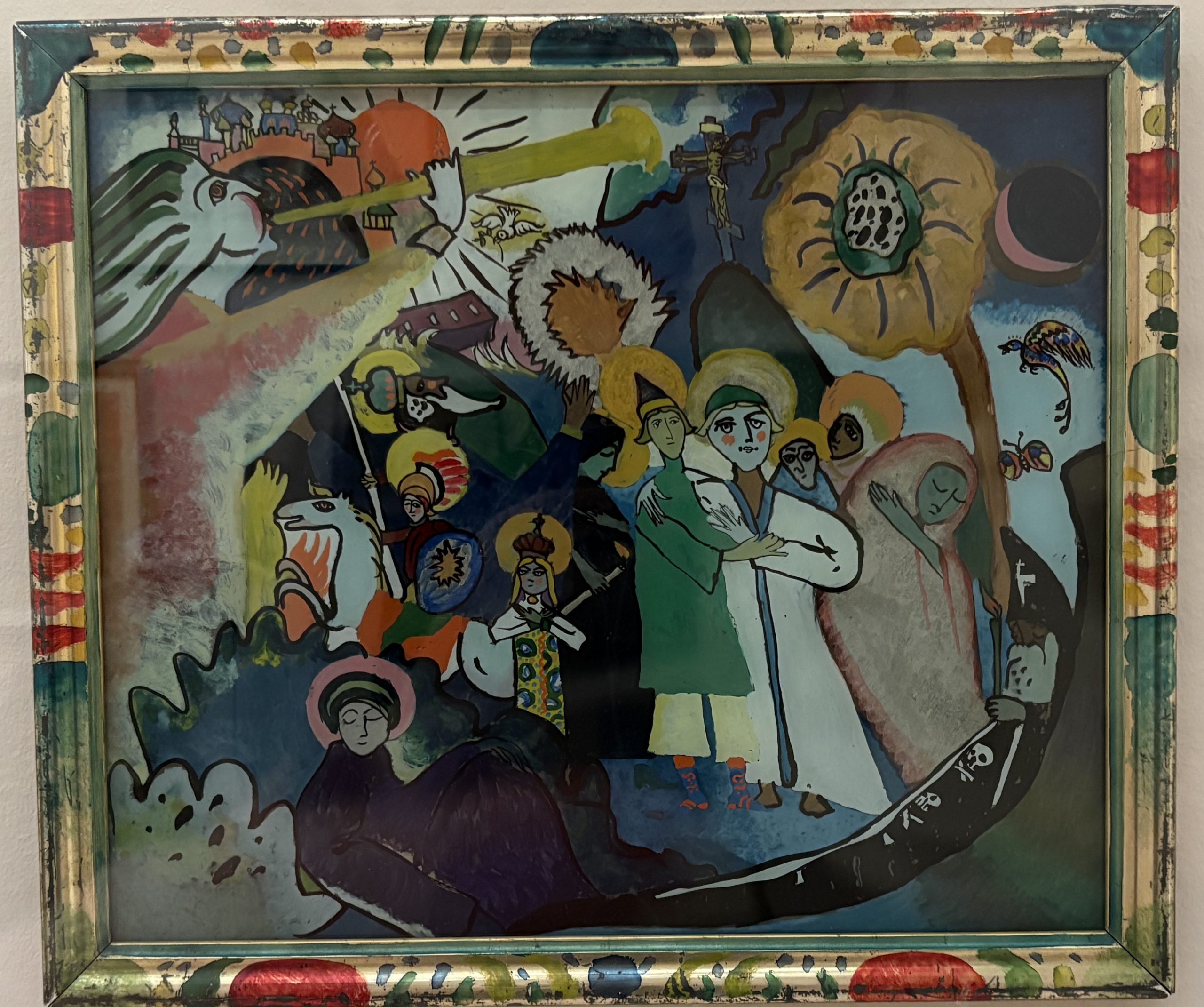 Moving through the exhibition is a largely chronological experience, beginning with “The Dialogue of Forms,” a section devoted to the cross-cultural inspirations behind the Blue Rider Almanac of 1912. The group drew heavily from Slavic folk art, children’s drawings, reverse-glass painting, and woodcuts. As noted in the exhibition text, this range of influences “illustrated an anti-academic, open-minded, international, and tolerant vision.”